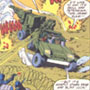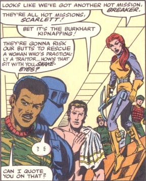 As a Cobra agent grabs a woman on a train, the camera pulls back to reveal two generals watching the scene on a large monitor, and one of the generals concludes that the G.I.Joe team is needed for the rescue. While a transport car races inside a glass tube, a hydraulic lift raises a VAMP to the ceiling of the Joes' base, which is underground, and drives away. Flash and Scarlett hit their targets during a training session and the camera focuses on a model fort on a table, which is surrounded by Flash, Stalker, Rock 'n' Roll and Clutch. Snake Eyes, Short-Fuze, Steeler and Rock 'n' Roll watch Hawk streak past them while driving a RAM inside the base and a MOBAT tank then plows through a stone wall, allowing Hawk, Scarlett and Snake Eyes to run forward and invade Cobra's fort. Flash and another member of the Joe team aim their laser rifles at the fort and Breaker disintegrates the wooden walls with a blast from a cannon. A Cobra agent races out of the stone castle in a car with the kidnapped woman, but a member of the Joe team streaks across the sky with a JUMP and reaches out for her hand. The camera pulls back and the cover of the first issue closes.