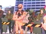 him onto the ground, removes her hood, bows and asks “Bazooka-san” how