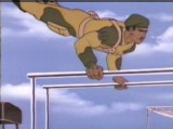 eye marks. Stalker, who is practicing on the parallel bars asks why she