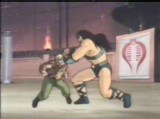 Duke and the ten foot tall opponent, Ramar, continue to fight while